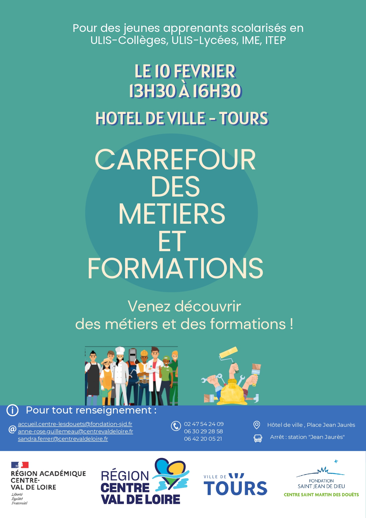 l'Hôtel de Ville de Tours accueillera le " Carrefour des Métiers et des Formations ". Cet événement est spécifiquement organisé pour les jeunes apprenants scolarisés en ULIS (collèges et lycées), IME, ITEP. Au programme de cet après-midi : Découverte de nombreux secteurs : Industrie, BTP, hôtellerie-restauration, propreté, services à la personne, commerce, logistique, ainsi que l'agriculture et l'horticulture. Rencontres avec des professionnels : Des représentants de CFA, lycées professionnels, MFR, ainsi que des employeurs du milieu ordinaire, adapté et protégé (ESAT, entreprises adaptées) seront présents pour répondre à toutes les questions. Mardi 10 février 2026 De 13h30 à 16h30 📍 Hôtel de Ville, Place Jean Jaurès, Tours